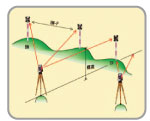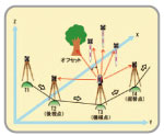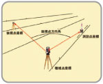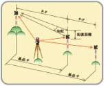 | 【トラバース測定】 既知の「機械点座標と後視点座標」あるいは「機械点座標と方向角」に基づいて、前視点の座標値を求めることができます。測距測角データの記録も可能です。また、オフセット観測、機械の据替移動にも対応しています。 |