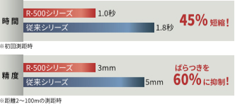 光学系を改良した新型EDM機構を搭載し、従来シリーズよりも測距時闇 と精度が向J-しました。測距値の表示を待つストレスが少なく、スピー ディーかつ高精度な測距作業を可能にします。太陽光の反射による影囲に ついても低減しました。
